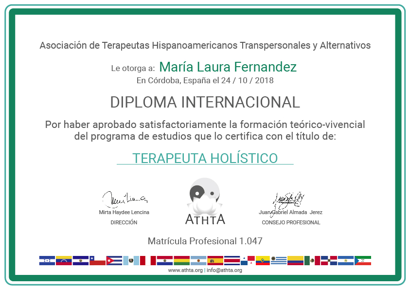 La Asociación de Terapeutas Hispanoamericanos Transpersonales y Alternativos ATHTA es una comunidad sin fines de lucro, que ofrece una referencia internacional de trayectoria y reconocimiento dentro de las Terapias Alternativas, Transpersonales y Holísticas a sus miembros, avalando su idoneidad y calidad humana en el ejercicio de su profesión, certificándolo con un distinguido Diploma en semejanza a su formación como: